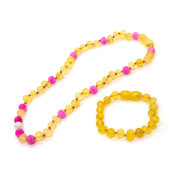 Baltic amber is an organic substance, a “fossil resin” produced by pine trees which grew in Northern Europe. By having the baby wear the necklace everyday it helps reduce the common symptoms related to teething such as: red cheeks, fever, swollen gums, and diaper rash.