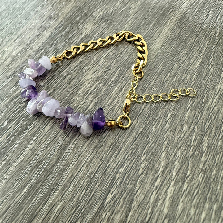 The beads in this mix include: Amethyst, Gold