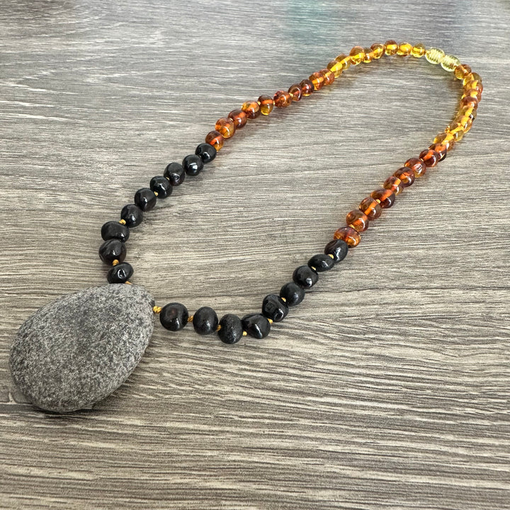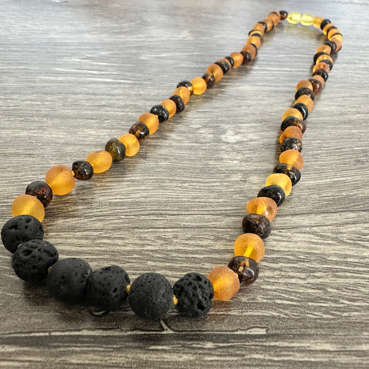 Necklaces are not for baby or adult to chew on, the Amber & other stones releases microscopic amounts of oil, as it warms with the body's natural temperature, that is absorbed into the skin and bloodstream. Baltic Amber contains succinic acid (anti-fever, anti-inflammatory), the compound that gives Baltic Amber teething necklaces the therapeutic quality. **FOR CHILDREN UNDER 3***Necklaces should be removed during naps and when unsupervised.