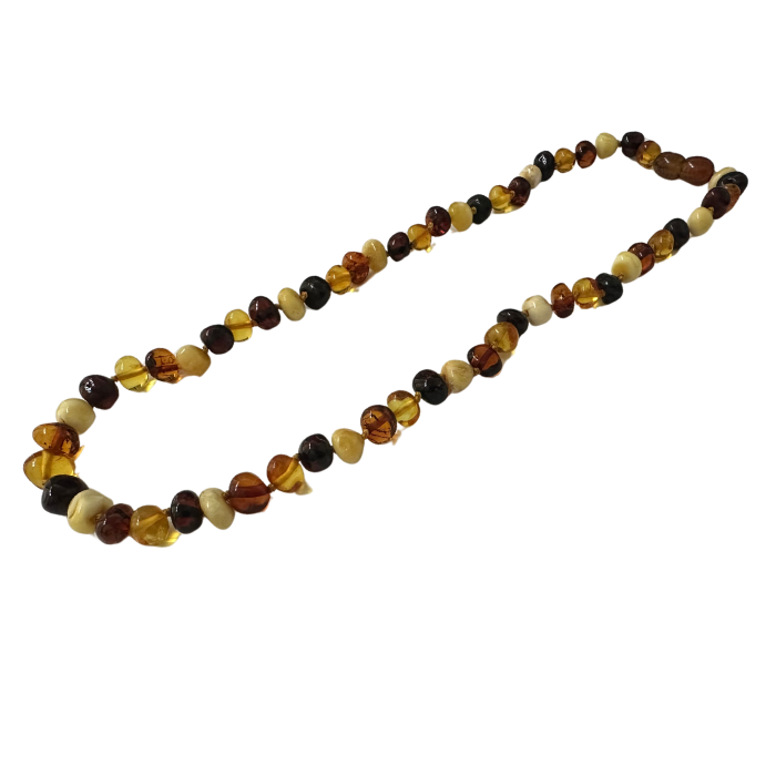 Is there actual food in the necklace? No, the colors of the necklace are shades: Milk is a whitish yellow, Lemon is a lemony yellow. Honey is a golden yellowish brown. It can vary light to dark based on when the amber was mined. Cognac is a darker brown and varies from light to dark based on when the amber was mined. Cherry is typically black in color. Occasionally you may notice some red or ruby tints but cherry is mostly black. Multi or Rainbow are a mix of three or four colors above typically. We also have semi-precious rainbow and that mixes the gemstones in our necklaces.